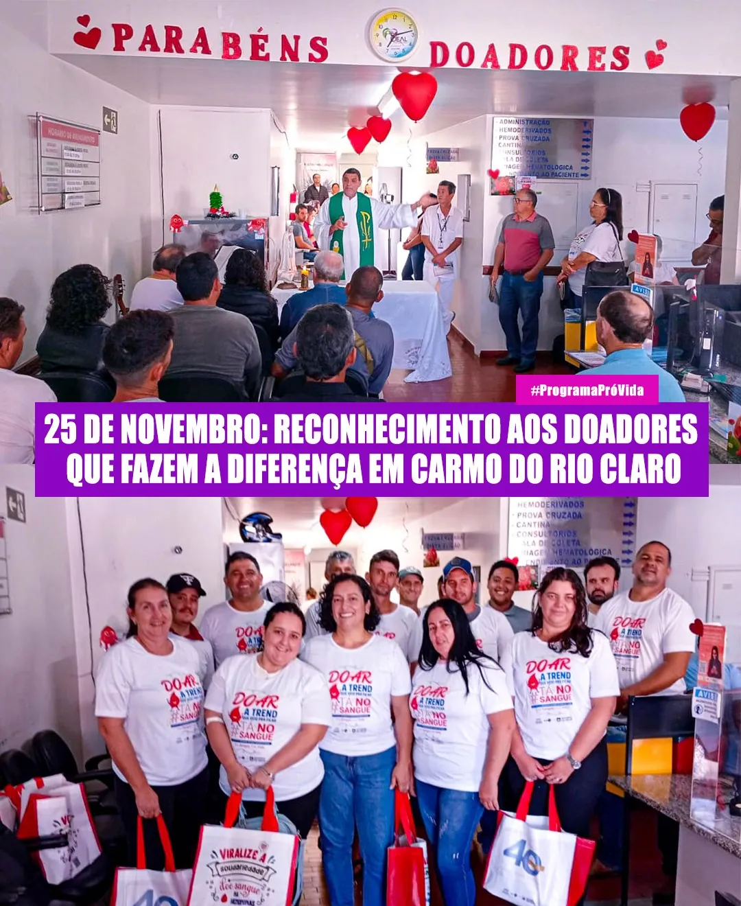 No Dia Nacional do Doador de Sangue, celebrado nesta terça-feira, 25 de novembro, Carmo do Rio Claro viveu um momento especial de união e cuidado com o próximo. A Prefeitura, por meio do Programa Municipal Pró-Vida, promoveu um Mutirão de Doação de Sangue em parceria com o Hemominas de Passos, reforçando a importância desse gesto que salva vidas todos os dias.