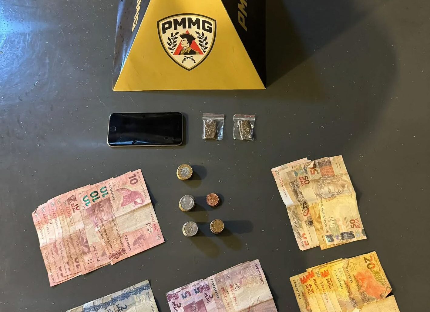 Durante a abordagem, os militares localizaram dinheiro em espécie, entorpecentes e um aparelho celular. Ao todo, foram apreendidas duas porções de substância análoga à maconha, R$ 577 em notas diversas e um celular modelo iPhone, materiais que reforçam os indícios de envolvimento com o tráfico de drogas.