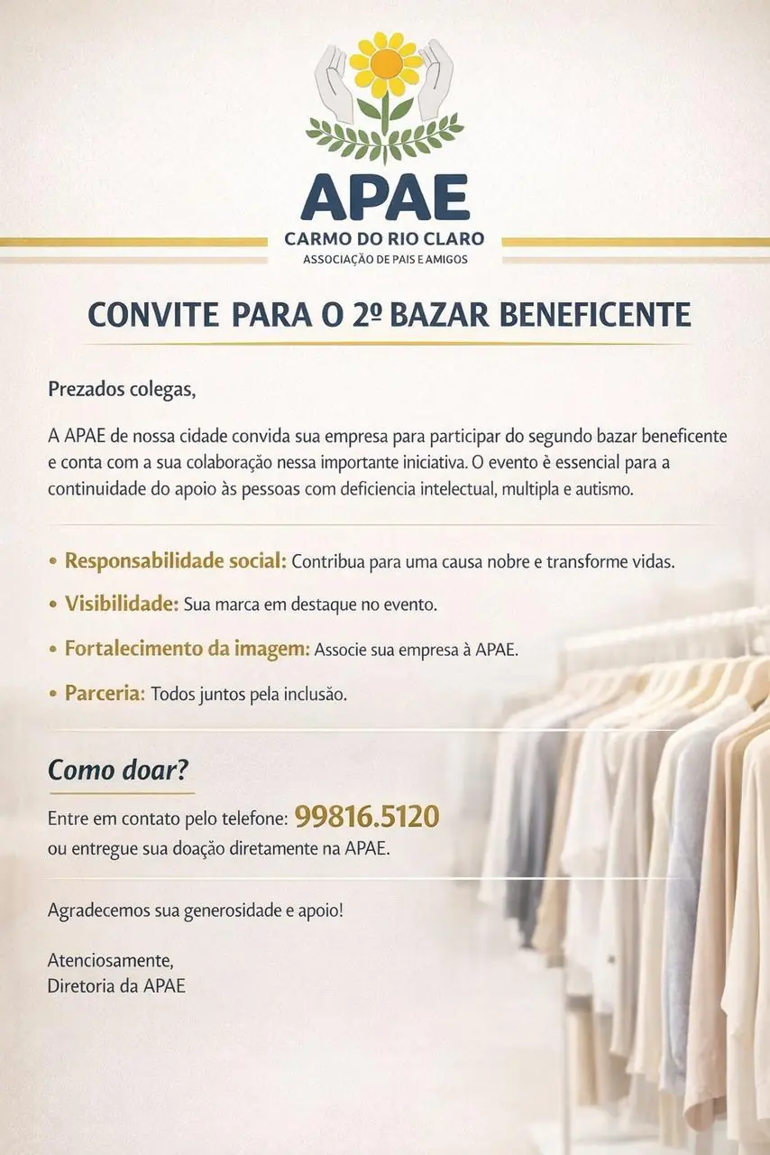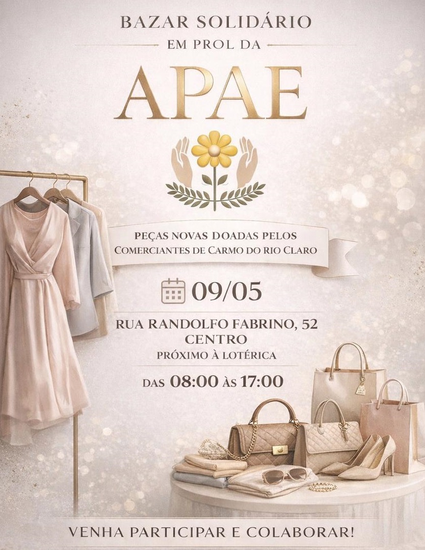 A APAE de Carmo do Rio Claro realizará, no próximo dia 09 de maio, o seu 2º Bazar Solidário. O evento acontecerá na Rua Randolfo Fabrino, nº 52, no Centro da cidade, com atendimento ao público das 8h às 17h.