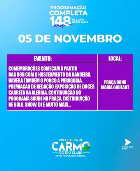 Todas as atividades acontecem na Praça Dona Maria Goulart, ponto central das comemorações que reforçam o espírito comunitário e o orgulho dos moradores de Carmo do Rio Claro.