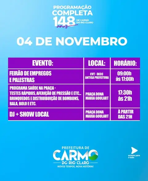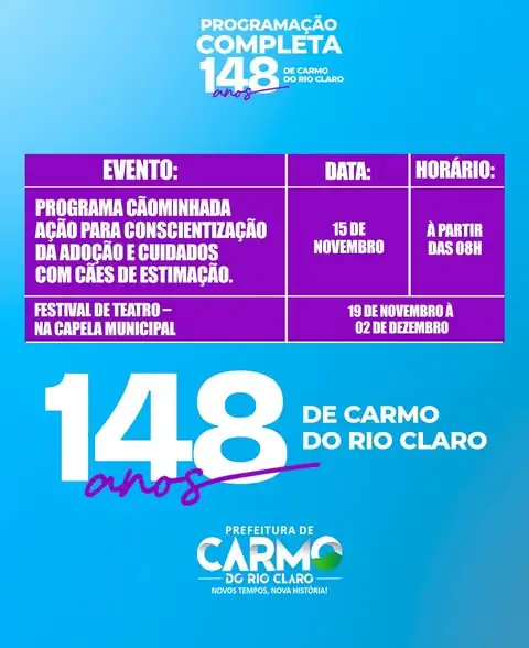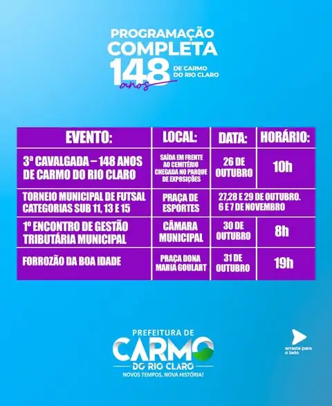 As comemorações pelos 148 anos de Carmo do Rio Claro, estão movimentando a cidade com uma programação repleta de atividades culturais, esportivas e sociais. O evento teve início com a 3ª Cavalgada – 148 Anos de Carmo do Rio Claro, que reuniu centenas de participantes em um momento de tradição e confraternização.