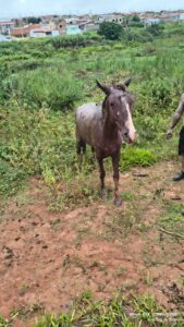 Ao chegarem ao local, os militares constataram que o animal estava ilhado e com dificuldades de locomoção devido ao terreno encharcado e ao acúmulo de água, situação que representava risco à sua integridade.