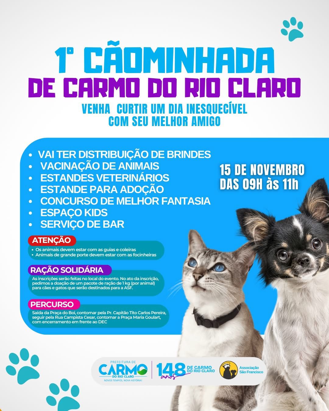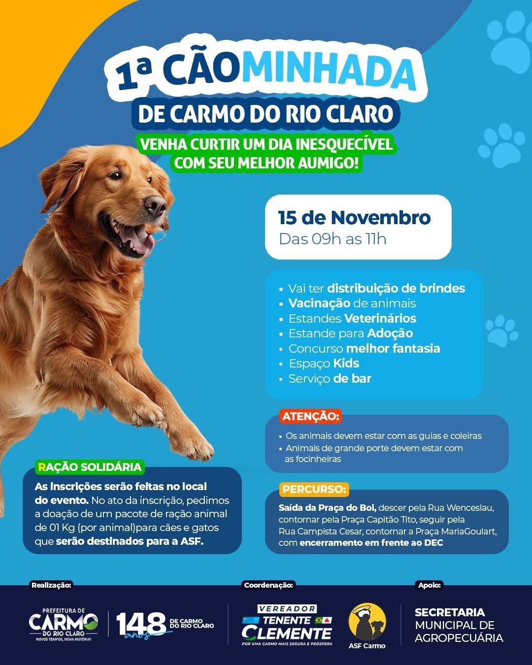 A 1ª Cãominhada de Carmo do Rio Claro, acontecerá neste sábado, 15 de novembro, das 9h às 11h. O evento é idealizado pelo vereador Tenente Clemente em parceria com a Associação São Francisco e recebe apoio da Prefeitura Municipal. A proposta é reunir tutores e seus pets em uma manhã de convivência, bem-estar e solidariedade.