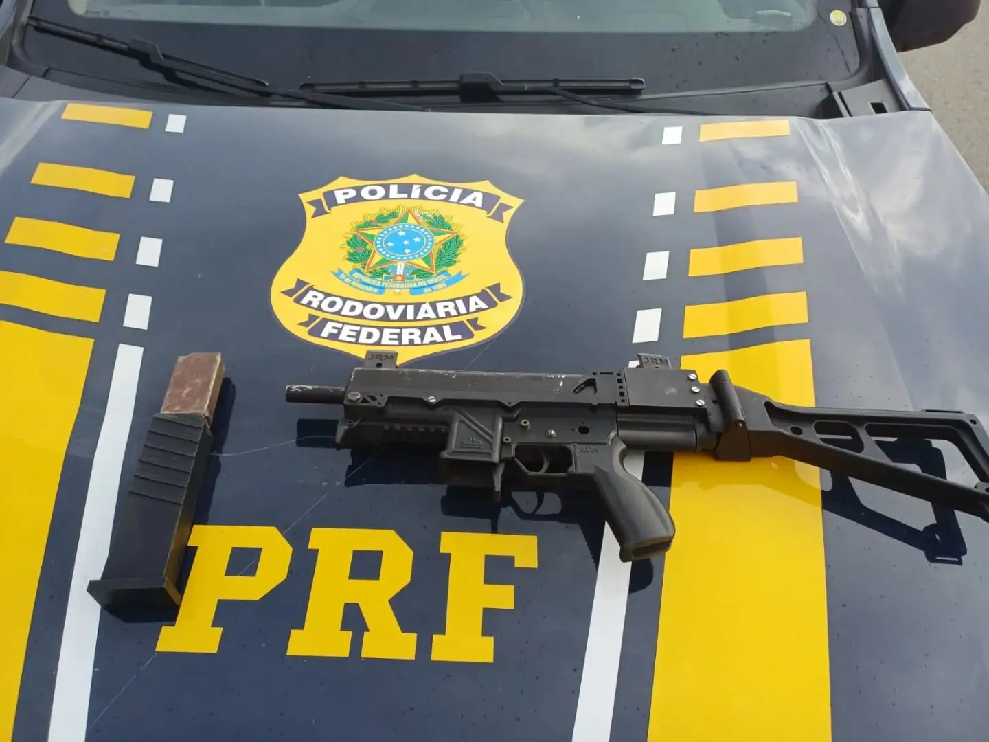 A PRF informou que o armamento apreendido é de uso restrito e que as investigações buscam identificar a procedência e o destino da submetralhadora.