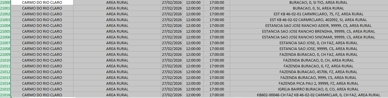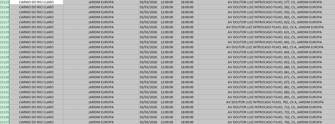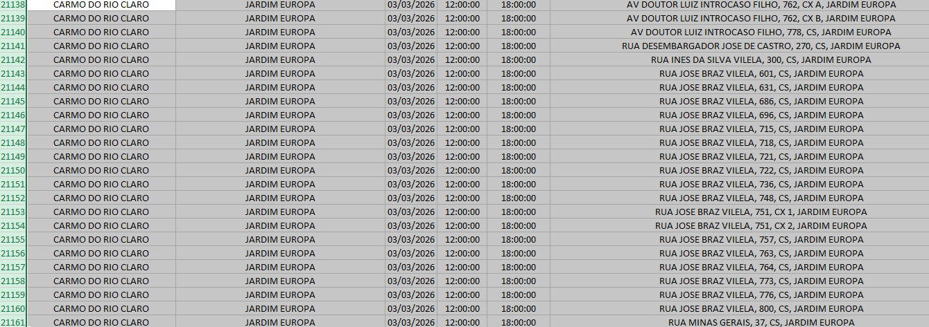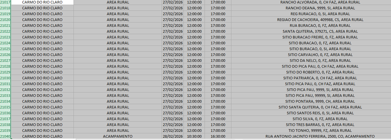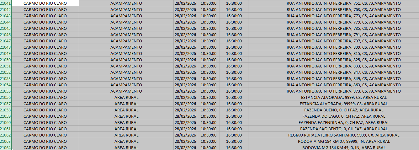 O fornecimento de energia será interrompido no dia 28 de fevereiro de 2026, às 10h30, com previsão de restabelecimento às 16h30 do mesmo dia. No entanto, a Cemig ressalta que a energia pode ser religada antes do horário previsto, caso os serviços sejam concluídos antecipadamente.
