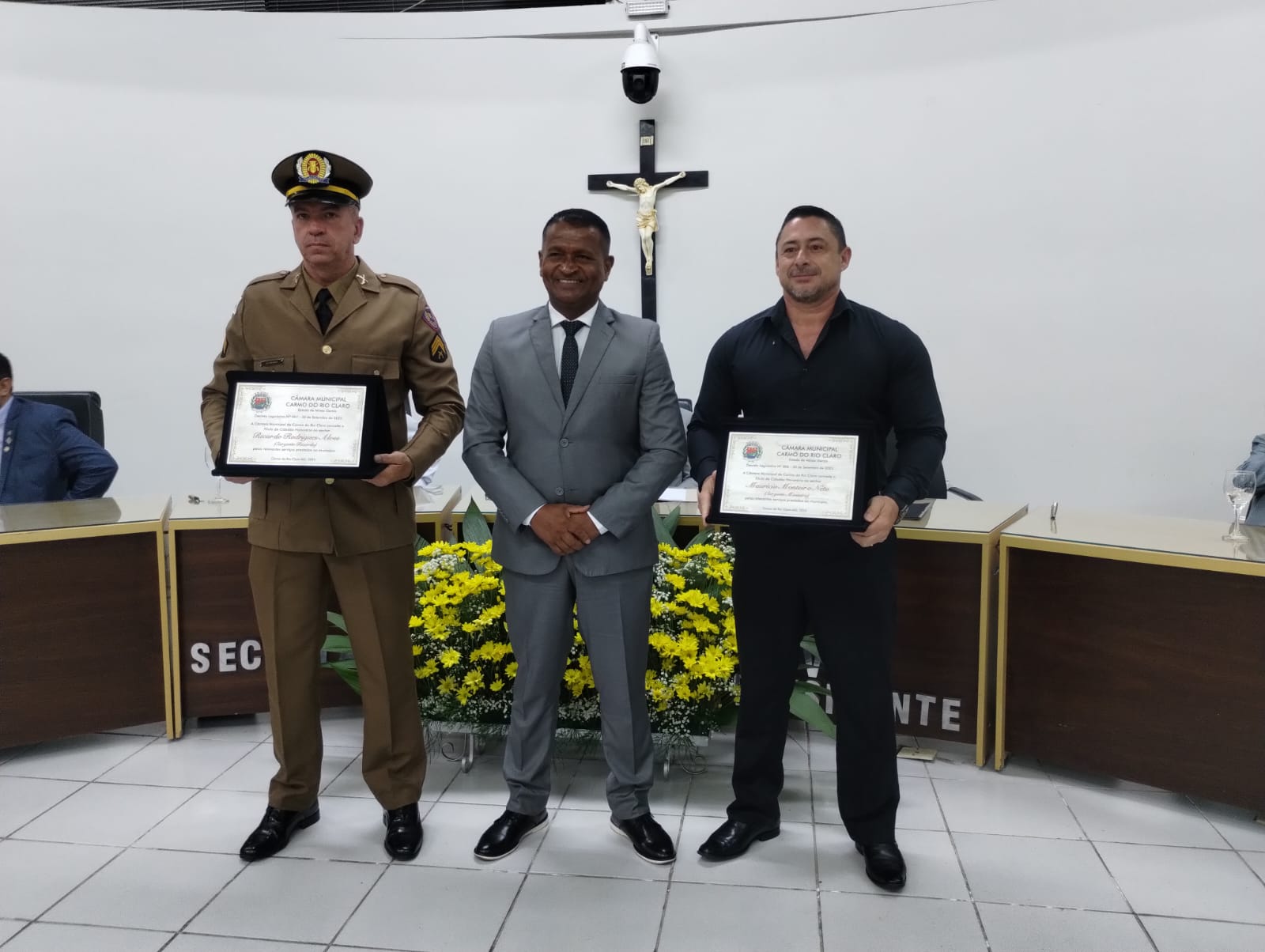 Em sessão solene, o Legislativo da Câmara Municipal de Carmo do Rio Claro, entregou no dia 28 de novembro, os Títulos de Cidadão Honorário aos sargentos Maurício Neto Monteiro e Ricardo Rodrigues Alves, reconhecendo suas trajetórias marcadas por dedicação, coragem e profundo compromisso com a segurança pública do município.