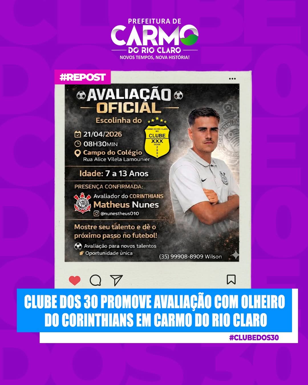 O Clube dos 30 realiza no próximo dia 21 de abril uma avaliação esportiva voltada para crianças e jovens de 7 a 13 anos, em Carmo do Rio Claro. A atividade contará com a presença de um avaliador ligado ao Corinthians, oferecendo aos participantes a chance de mostrar talento e buscar oportunidades no futebol.