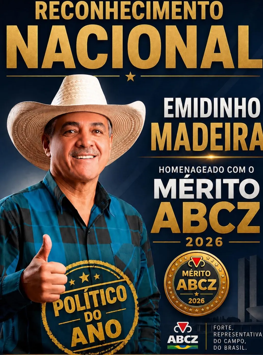 A Associação Brasileira dos Criadores de Zebu concederá ao deputado federal Emidinho Madeira o Mérito ABCZ 2026, uma das mais importantes honrarias do agronegócio brasileiro. A premiação reconhece personalidades que se destacam na contribuição para o desenvolvimento do setor no país.
