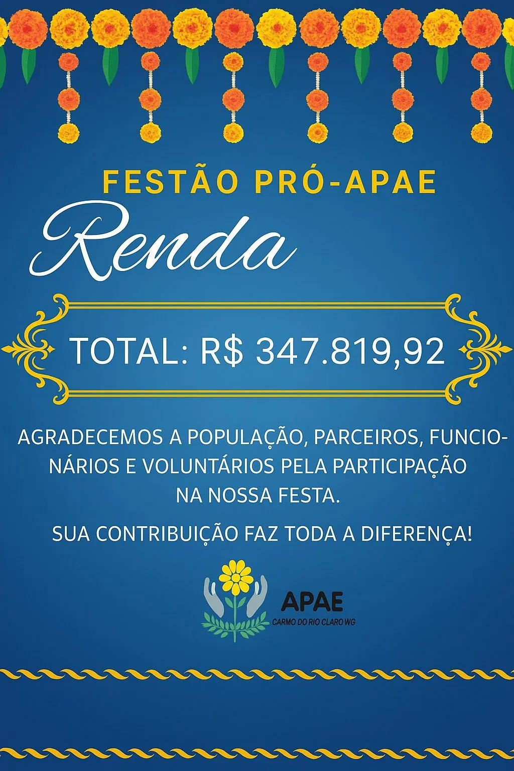 A APAE de Carmo do Rio Claro (MG) divulgou esta semana o resultado oficial do Festão em prol da entidade, realizado no início de outubro. O evento, marcado por muita alegria e solidariedade, arrecadou o valor expressivo de R$ 347.819,82, que será destinado à manutenção das atividades e melhorias na instituição.