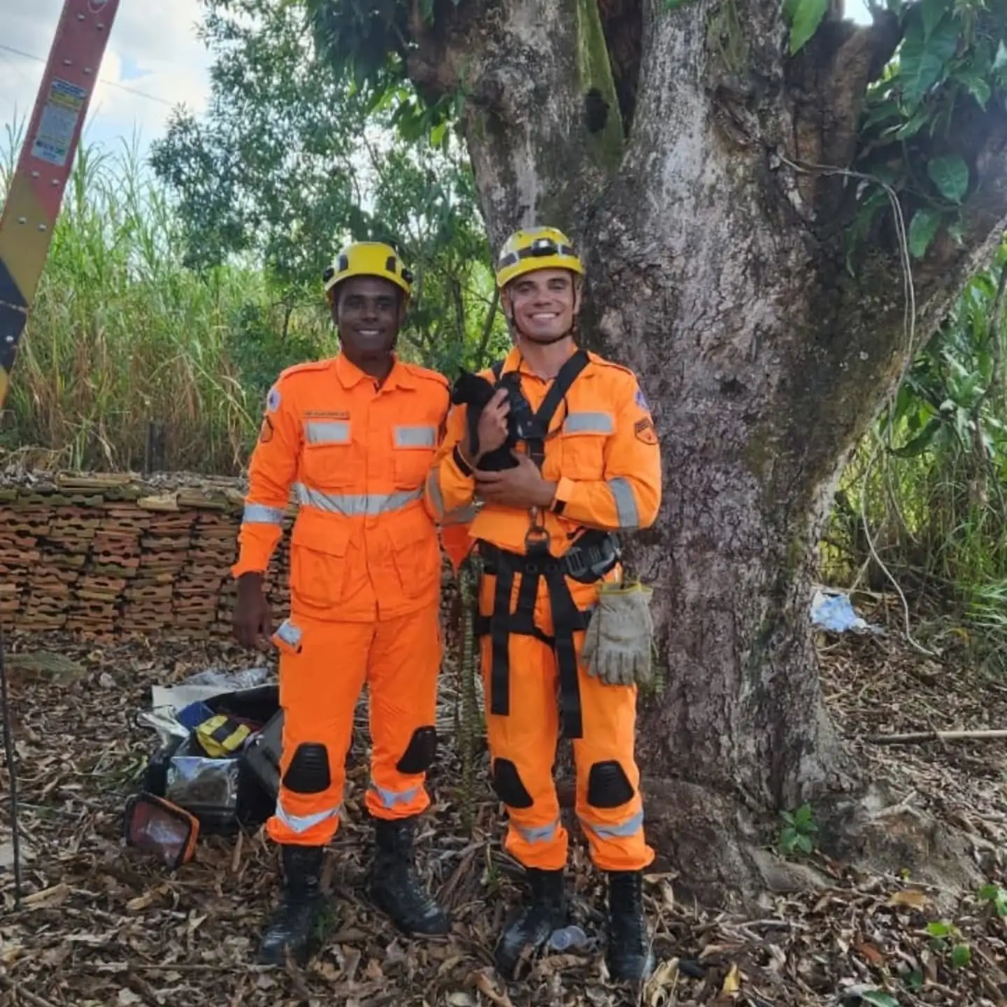 Para alcançar o gatinho com segurança, foram utilizados equipamentos apropriados de escalada. A operação foi realizada com cautela, já que o animal, assustado, poderia se mover de forma inesperada e acabar se ferindo.