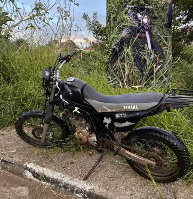 A Guarda Civil Municipal localizou uma motocicleta abandonada em meio a um matagal na Avenida dos Palmares, no bairro Serra das Brisas, durante patrulhamento preventivo.