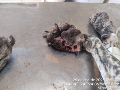 Os cães foram resgatados e encaminhados ao Centro de Acolhimento de Animais de Rua (CAAR) do município. Conforme avaliação da médica veterinária responsável, uma das cadelas apresentava diversas lesões, onicogrifose, miíase, intensa secreção ocular e resultado positivo para leishmaniose visceral canina.