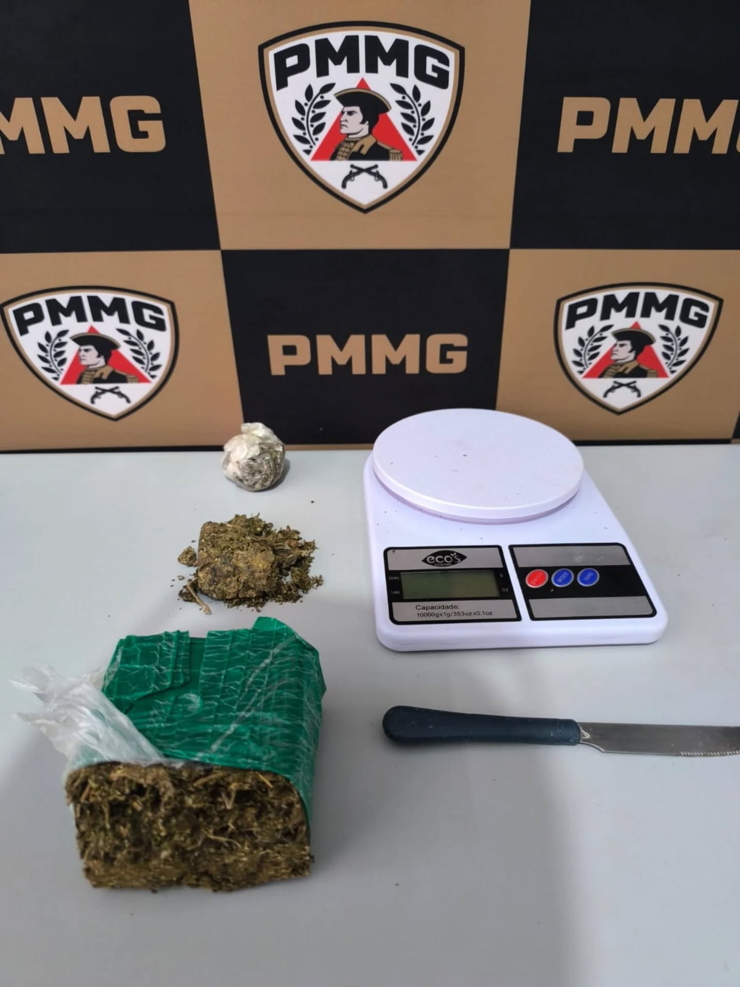 Com autorização do suspeito, os militares realizaram buscas em sua residência, onde encontraram mais drogas escondidas. Uma nova porção de maconha foi localizada dentro da gaveta de legumes da geladeira, além de uma balança de precisão e uma faca com vestígios da substância sobre a mesa da cozinha.