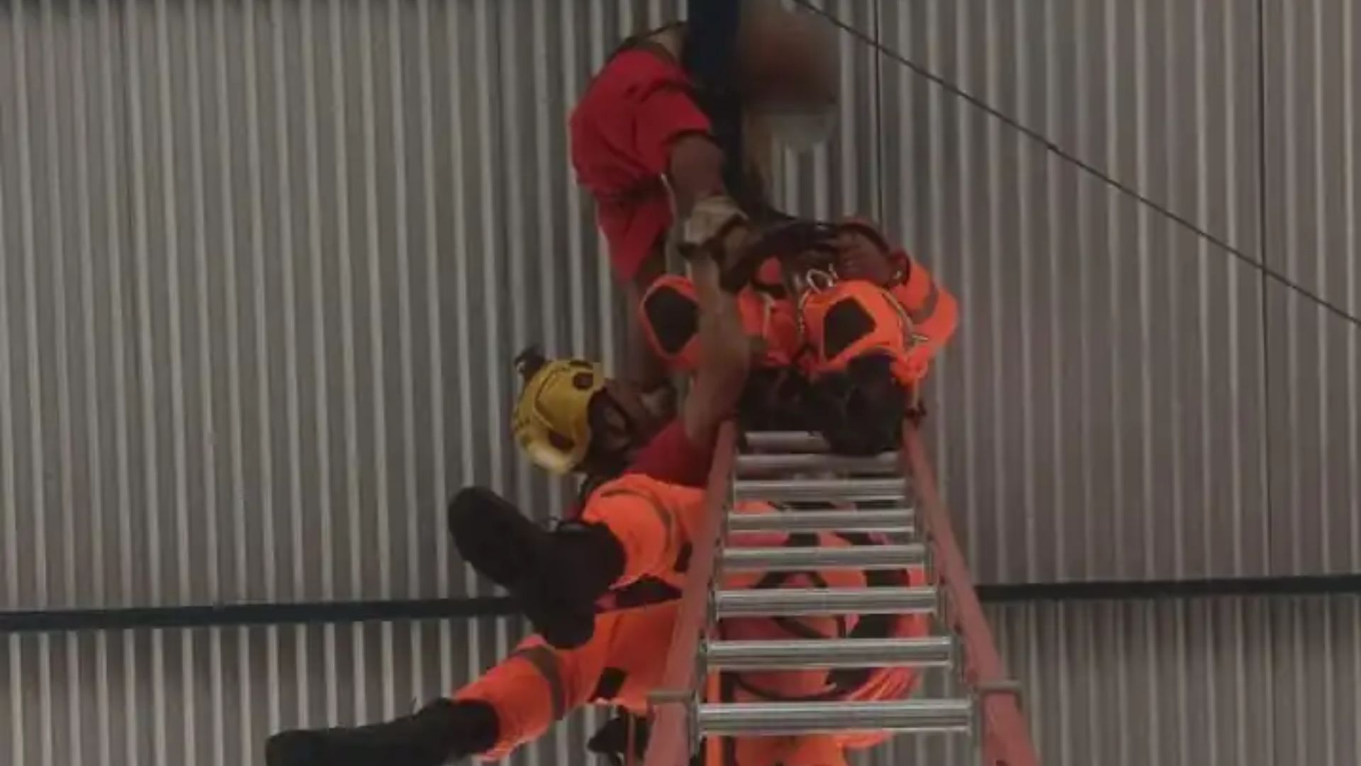 Jovem fica preso em estrutura a 15 metros de altura em quadra e é resgatado