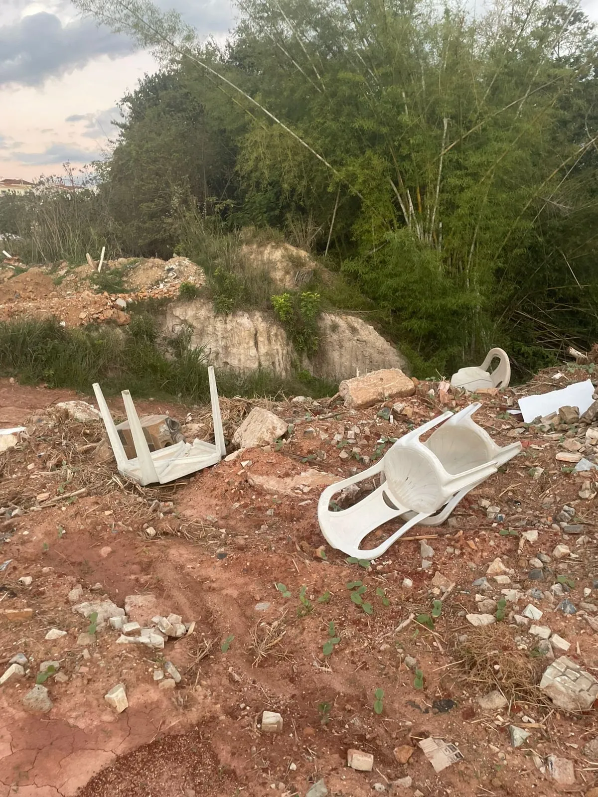 Uma moradora da Rua Joaquim Pio Vilela, em Carmo do Rio Claro (MG)s, denunciou o descarte irregular de lixo e entulho no fundo da obra em andamento na região. Segundo ela, materiais como cadeiras de plástico quebradas, restos de construção e lixo doméstico estão sendo jogados no local de forma frequente.