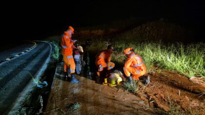 A equipe de resgate encontrou a vítima agitada, bastante confusa e sem responder adequadamente aos questionamentos. Após avaliação inicial, foram constatados trauma leve na região da cabeça, escoriações nos membros superior e inferior direitos e suspeita de fratura no ombro direito.