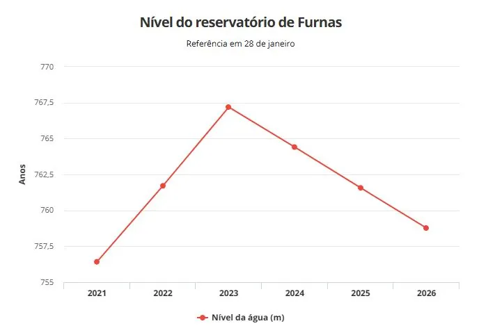 O nível do reservatório de Furnas subiu 1,06 metro em janeiro, devido às chuvas intensas e chegou a 757,71 m. Mas, ainda assim, é o menor para o período nos últimos cinco anos (veja gráfico abaixo) e segue abaixo da cota mínima considerada ideal, que é 762 metros.