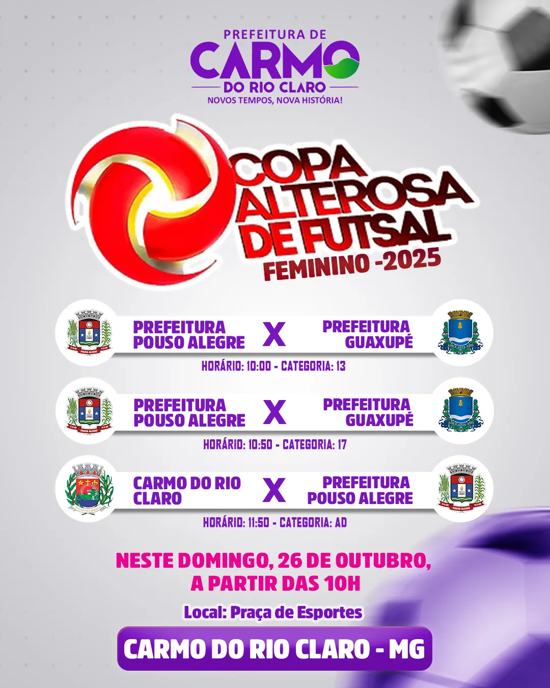 A Praça de Esportes de Carmo do Rio Claro (MG), será o palco de mais uma emocionante etapa da Copa Alterosa de Futsal Feminino, neste domingo, 26 de outubro. O evento promete movimentar o público com disputas acirradas e muito talento em quadra, reunindo equipes de diversas cidades da região.