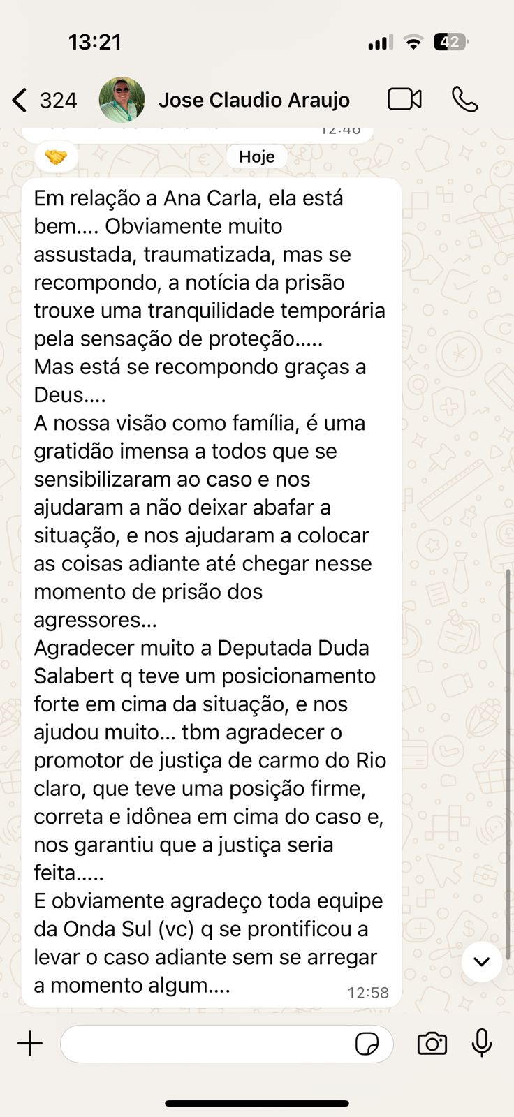 E, obviamente, agradeço toda a equipe da Onda Sul, que se prontificou a levar o caso adiante sem recuar em momento algum.”