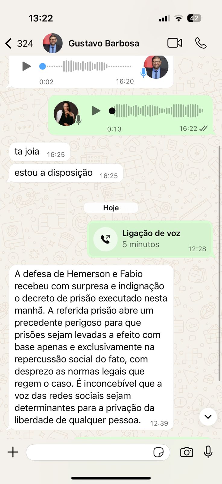 “A defesa de Hemerson e Fabio recebeu com surpresa e indignação o decreto de prisão executado nesta manhã. A referida prisão abre um precedente perigoso para que prisões sejam levadas a efeito com base apenas e exclusivamente na repercussão social do fato, com desprezo às normas legais que regem o caso. É inconcebível que a voz das redes sociais seja determinante para a privação da liberdade de qualquer pessoa.”