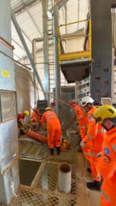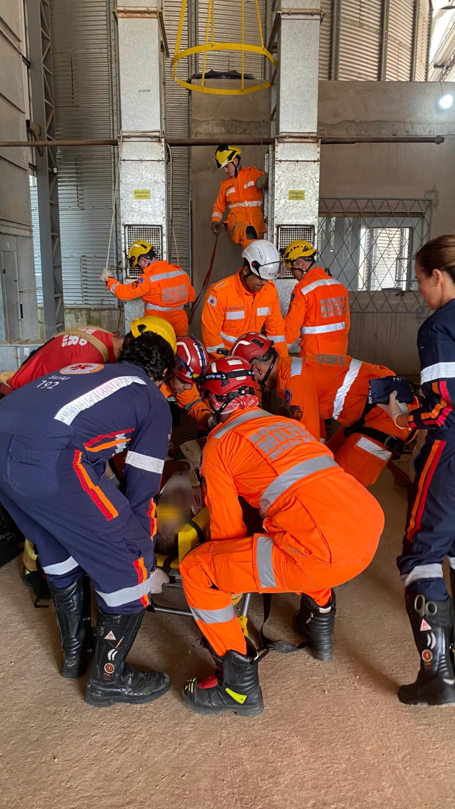 Após alcançarem o trabalhador, os socorristas realizaram a avaliação primária, imobilizaram as fraturas e estabilizaram o quadro clínico ainda no interior da estrutura. Em seguida, ele foi colocado em uma maca do tipo Sked para a retirada vertical.