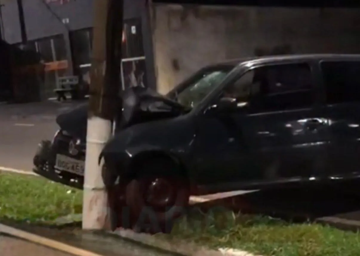 Um carro colidiu violentamente contra um poste na Avenida Jovino Fernandes Sales, próximo à praça do bairro Pinheirinho, em Alfenas, no Sul de Minas, durante a madrugada desta segunda-feira (3).