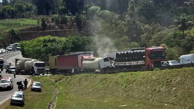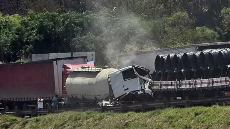 O acidente ocorreu por volta das 11h05 em um trecho onde há obras e o trânsito seguia lento. De acordo com a Polícia Rodoviária Federal (PRF), um caminhão carregado com cimento não conseguiu frear a tempo e colidiu contra outro caminhão que transportava bobinas. Em seguida, uma carreta que vinha logo atrás também se envolveu na batida. Um carro foi empurrado para fora da pista, escapando por pouco de ser prensado entre os veículos de carga.
