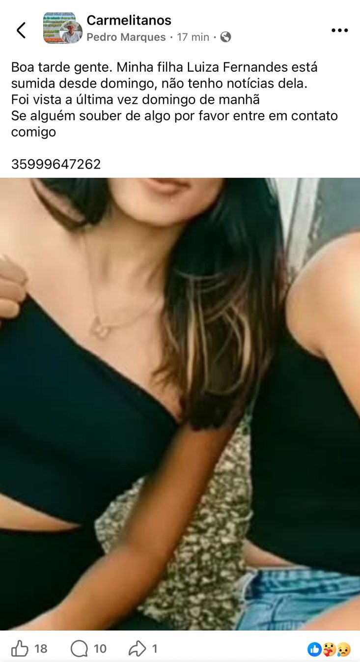 De acordo com o pai, Pedro Lídio, Luiza Fernandes dos Santos Marques saiu de casa na parte da manhã e não retornou. Testemunhas informaram que ela foi vista por volta das 10h no restaurante Tropeiro Mineiro. Depois desse horário, não houve mais contato.
