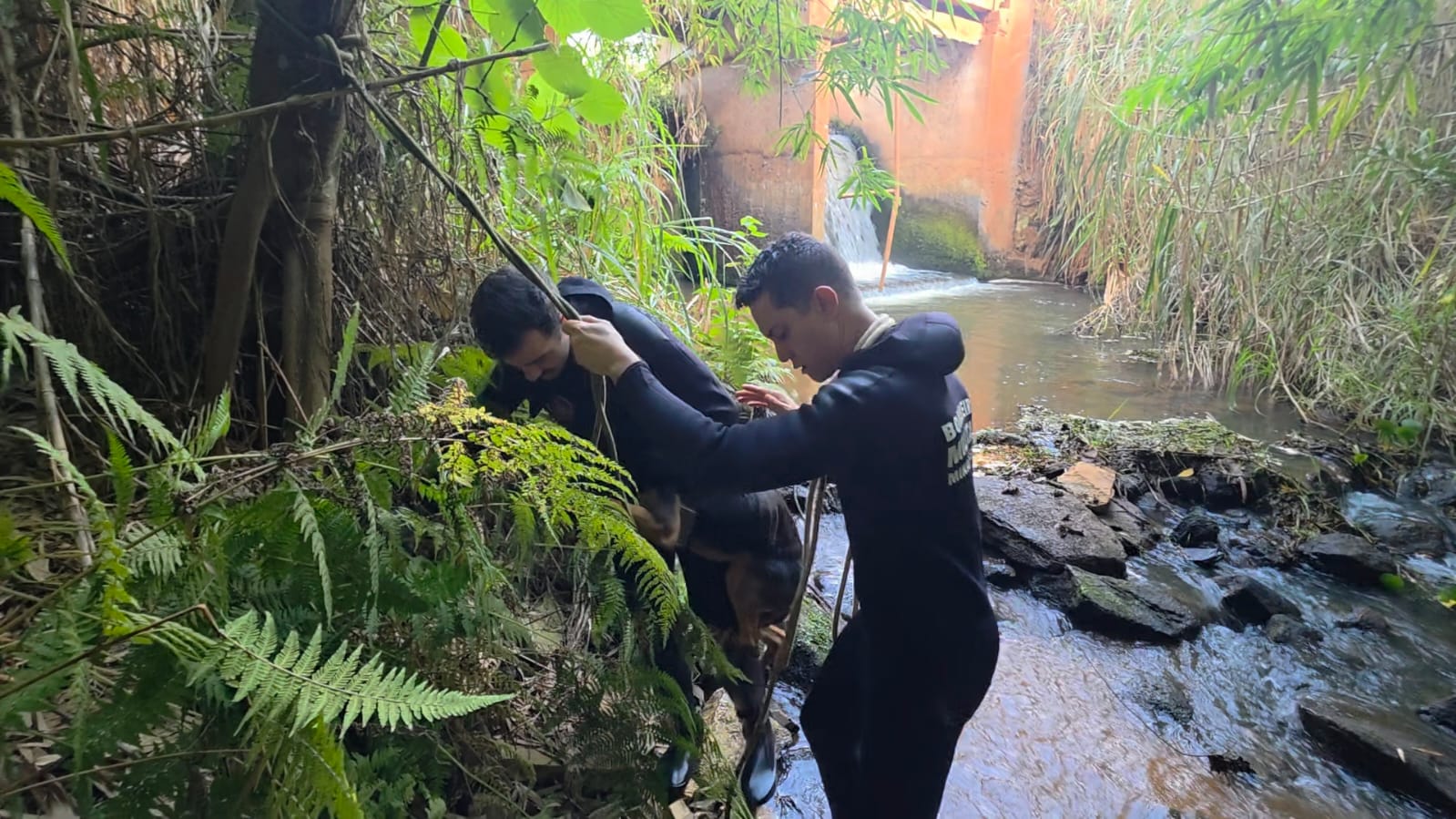 Segundo informações da corporação, um cão ficou ilhado em um ponto de difícil acesso, em meio a uma área de mata fechada. Diante da situação, os militares precisaram avançar por terreno irregular até localizar o animal, que estava sob a estrutura de uma ponte, cercado por água.