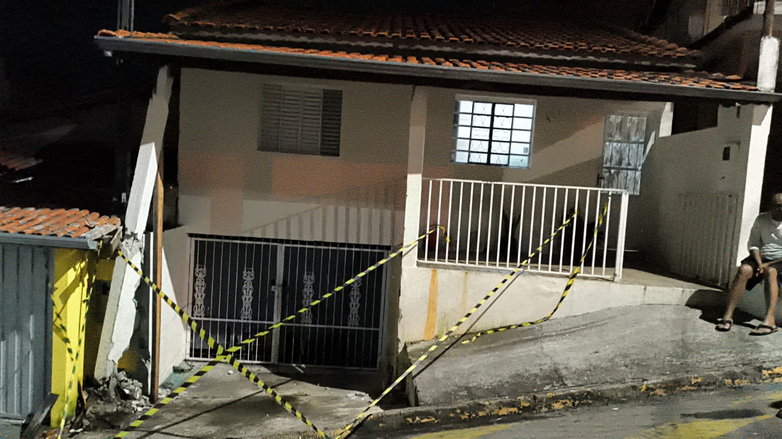 Com o impacto, uma coluna estrutural foi deslocada, comprometendo uma viga de sustentação e provocando o cedimento parcial do telhado do imóvel, aumentando o risco de colapso.