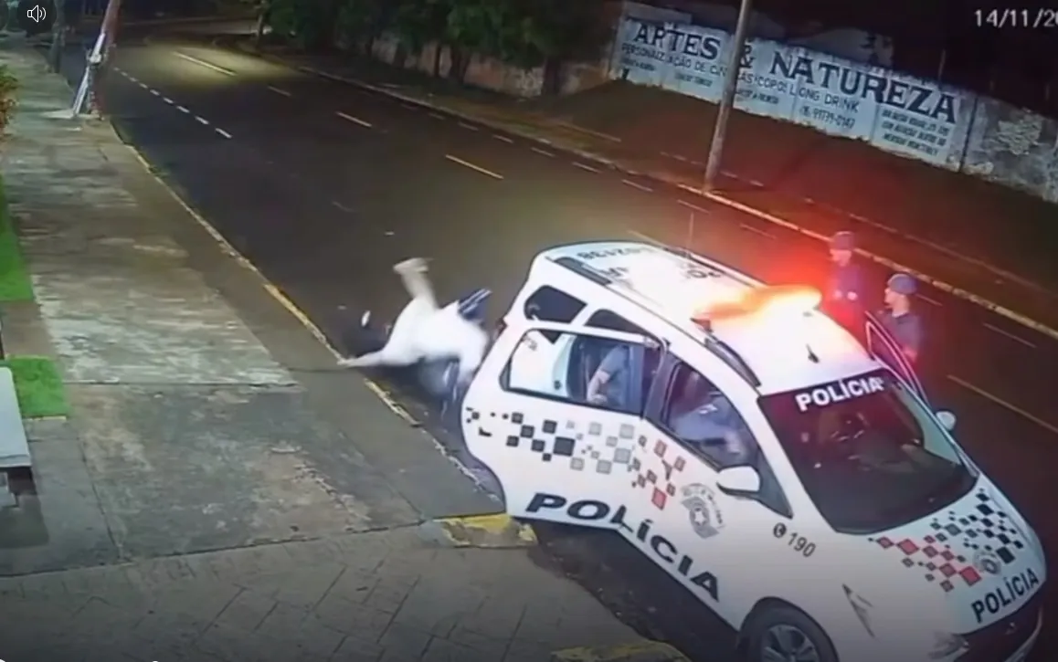 Uma ocorrência curiosa terminou em prisão na noite desta última sexta-feira (14/11), em Araçatuba (SP). Câmeras de segurança registraram o momento em que um motociclista de 22 anos, visivelmente alcoolizado, atingiu a parte traseira de uma viatura da Polícia Militar que estava parada em uma fiscalização de rotina.